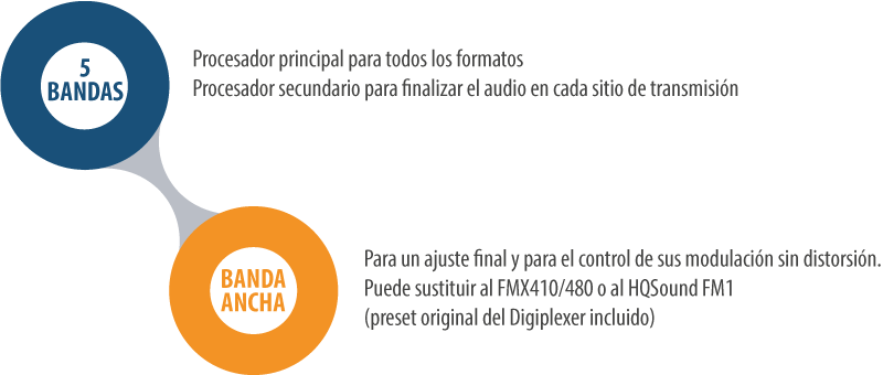 - Procesamiento de 5 bandas o de banda ancha basado en DSP